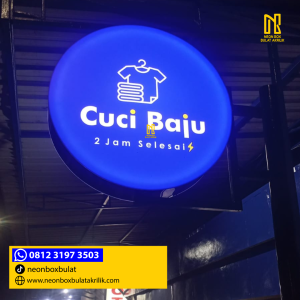 Penggunaan neon box bulat sangat cocok untuk berbagai jenis usaha. Untuk laundry modern, neon box ini bisa menampilkan logo berbentuk tetesan air atau mesin cuci dalam lingkaran.